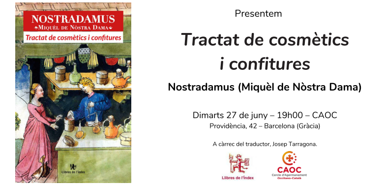 [post_excerpt] => Un receptari de l’apotecari, astròleg i visionari occità Miquèl de Nostradamus sobre temes de bellesa, farmàcia i melmelades. Presentació a càrrec del traductor, Josep Tarragona, el dimarts 27 de juny.