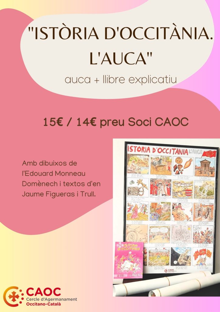 Ja la tenim aquí! L'Auca del CAOC sobre la història d'Occitània amb un llibret explicatiu de cada vinyeta. Dibuixos de l'Edouard Monneau Doménech i textos d'en Jaume Figueras i Trull.