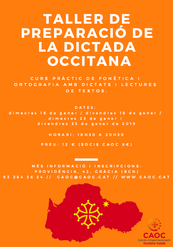 Es tracta d'un curs pràctic de fonètica i ortografia amb dictats i lectures de textos, dirigit a un públic sense coneixements de l'occità. El preu del curs és de 12€ i 8€ pels socis de l'entitat i s'impartirà a la seu de la nostra entitat, al carrer Providència 42 (barri de Gràcia, Barcelona).