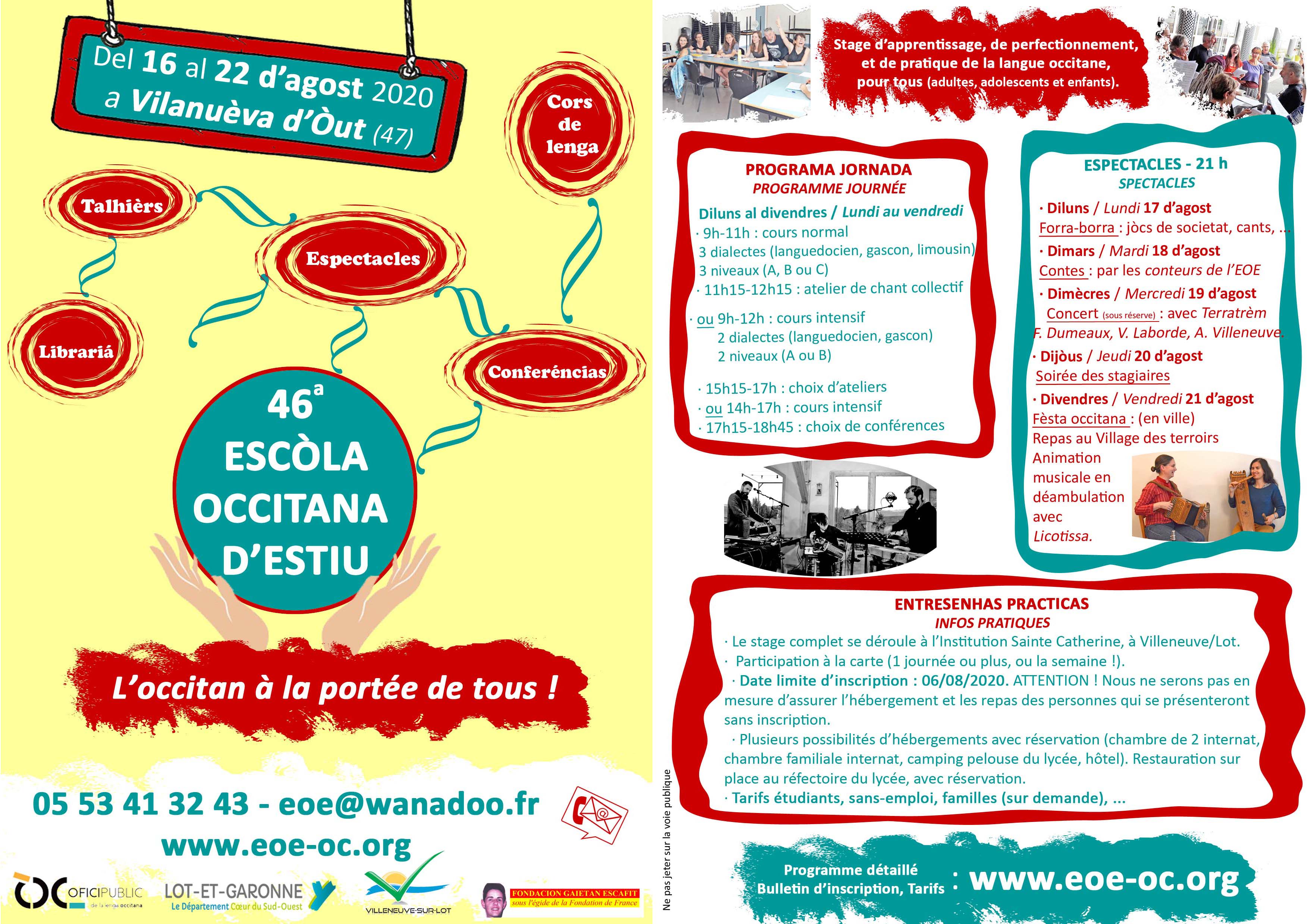 Vos podèm dire uèi que l'estagi d'estiu de l'Escòla Occitana d'Estiu se debanarà plan del 16 al 22 d'agost a Vilanuèva, mai prèp de la vila, a l'Institucion Santa Catarina. Totas las activitats seràn mantengudas, mai o mens, (corses, talhièrs, conferéncias, espectacles) dins la mesura de compatibilitat amb las règlas sanitàrias.